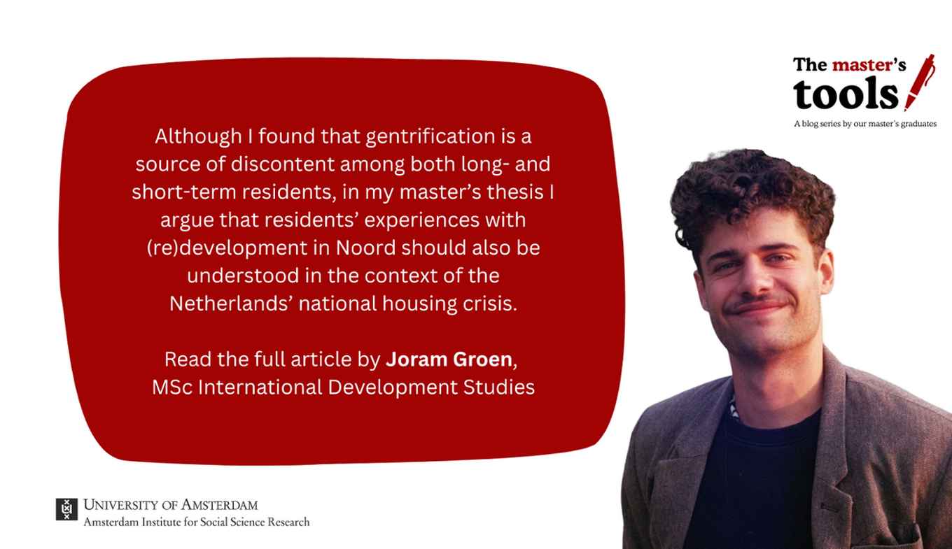 In my master’s thesis, I aimed to find out why Noord’s residents were unhappy with the (re)development of their district. Though I found that gentrification is the cause of some discontent among both long- and short-term residents, I argue that resident’s experiences with (re)development in Noord should also be seen in the context of the Netherlands’ national housing crises.